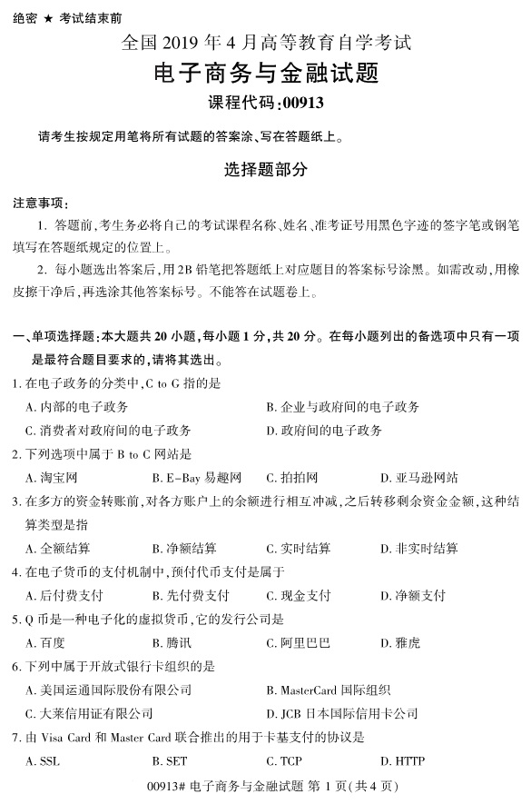 全国2019年4月自考00913电子商务与金融试题